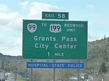 South of downtown Grants Pass, US 199 meets Oregon Route 99 (OR 99) and OR 238 and splits at a partial interchange. The main Redwood Highway turns north with OR 99, passing through downtown and ending at exit 58 on I-5, while the Redwood Spur No. 482, locally known as Grants Pass Parkway, continues straight, bypassing downtown to end at I-5 exit 55. Both of these are signed in both directions as US 199, while signage on US 199 itself at the split only shows "OR 99 north" for the mainline through downtown and "to I-5" for the bypass. On I-5, exit 55 is marked as "US 199", but exit 58 is "OR 99 to US 199".[3] The Oregon Transportation Commission's defined routing of US 199 takes it along the main Redwood Highway through downtown,[4] and the OTC calls the spur to exit 55 "US 199 Spur",[5] but, consistent with signs on I-5 (but not on the surface), the Oregon Department of Transportation calls the spur US 199[6] and the downtown route OR 99 only.[7]