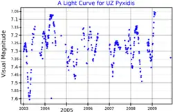 UZ Pyxidis is classified as a semiregular variable with a dominant period of 159.6 days. It varies in brightness between magnitude 6.99 and 7.63.[3] The variability was first reported in 1972,[15][11] and the variable star designation UZ Pyxidis was assigned in 1978.[16]