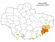 By the 2001 census 91,500 Greeks remained, the vast majority of whom (77,000) still lived in the Donetsk Oblast. Higher estimates such as 160,000[1] were reported previously, the fall being explained by assimilation forced by the Soviet government. Other small populations of Greeks are in Odesa and other major cities.