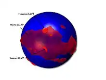 Ultra low velocity zones (ULVZs) are patches on the core-mantle boundary that have extremely low seismic velocities. The zones are mapped to be hundreds of kilometers in diameter and tens of kilometers thick. Their shear wave velocities can be up to 30% lower than surrounding material. The composition and origin of the zones remain uncertain. The zones appear to correlate with edges of the African and Pacific large low-shear-velocity provinces (LLSVPs)[1] as well as the location of hotspots. [2] [3]