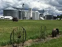 Top: Aerial view of Uniontown in 2023, Bottom: Uniontown grain elevators alongside the highway