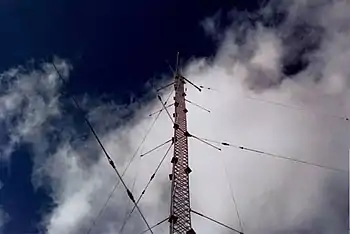 - ↑ U.S. Patent 6,133,890 abstract: A self-resonant vertically polarized folded unipole antenna for long wave (LW) [and] medium wave (MW) broadcasting, and for the 160 meter amateur radio band with a grounded tower connected to radially descending fold wires terminated near the base of the tower in an open polygonal ring, possibly a C-ring with a reactive load in series with this ring. This reactance cancels the reactive component of the antenna input impedance causing the input impedance to appear resistive at the feed point. This leads to outstanding linearity and bandwidth up to and possibly exceeding plus or minus 16 kHz, sometimes exceeding plus and minus 20 kHz.