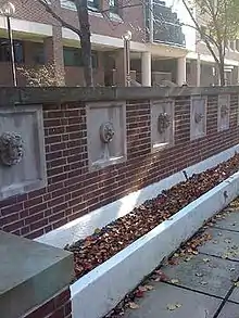 Past the archway is the wall with faces, still on the east side of the plaza. The wall is made out of red brick and concrete and contains seven cast stone faces.[1] There are two “face” designs that alternate down the wall, a cherub and a lion (the same that are found on the archway), and a square concrete section surround each. This wall has the features of a fountain, the cherub and lion faces have spouts [1] and there is a white reservoir located below the faces. The top of the wall, through the middle, has an open section possibly used for planting flowers. The length of the wall is 23.5’, the width is 4.5’, and finally it is 4’ tall. The reservoir is 23.5’ in length, 2.5’ in width, and 1’ in height. The square sections around each face is 2' in length by 2' in width All of the faces are circular and the same size, measuring about 6” in diameter.