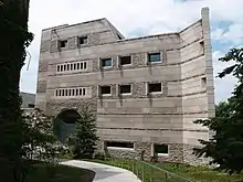 To the west of Tjaden Hall is the Herbert F. Johnson Museum of Art (1973) designed by I.M. Pei. The original design included an underground gallery north of the main structure. Early designs extended this space under University Avenue and included windows overlooking Fall Creek gorge. This gallery was not built due to funding. However, in response to a dramatic increase in the museum's collection, an altered version of that addition, totalling 16,000 square feet (1,500 m2) of above and below ground space was built to the north of the existing building. It was designed by the original building's architects at Pei Cobb Freed & Partners, including the original architect-in-charge, Cornell alumnus John L. Sullivan, III and opened in October 2011.[11] Previously, Morse Hall stood next to Franklin/Tjaden Hall, but it was destroyed by a fire in 1916.