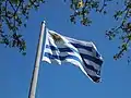 The national flag of Uruguay (Spanish: Pabellón Nacional) is one of the three official flags of Uruguay along with the flag of Artigas and the flag of the Treinta y Tres. It has a field of nine equal horizontal stripes alternating white and blue. The canton is white, charged with the Sun of May, from which 16 rays extend, alternating between triangular and wavy.[1] The flag was first adopted by law on 18 December 1828, and had 19 alternating stripes of white and blue until 11 July 1830, when a new law reduced the number of alternating stripes to nine.[2] The flag was designed by Joaquín Suárez.[2]