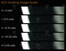 Demonstration of anterior chamber cells (ACCs) indicative of noninfectious anterior uveitis, as represented visually by the Tarsier Grading Image Scale (TGIS). Immune cells are represented by white dots.[19]