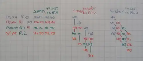 Having to perform 4-wide simultaneous 64-bit LOADs and 64-bit STOREs is very costly in hardware (256 bit data paths to memory). Having 4x 64-bit ALUs, especially MULTIPLY, likewise. To avoid these high costs, a SIMD processor would have to have 1-wide 64-bit LOAD, 1-wide 64-bit STORE, and only 2-wide 64-bit ALUs. As shown in the diagram, which assumes a multi-issue execution model, the consequences are that the operations now take longer to complete. If multi-issue is not possible, then the operations take even longer because the LD may not be issued (started) at the same time as the first ADDs, and so on. If there are only 4-wide 64-bit SIMD ALUs, the completion time is even worse: only when all four LOADs have completed may the SIMD operations start, and only when all ALU operations have completed may the STOREs begin.