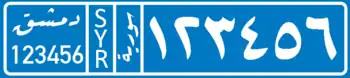 The Syrian license plates since 1997 have black lettering on a white background.[1] The plate is divided into 4 sections (when viewed from left to right):
