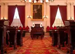 The two chambers of the Vermont General Assembly are on the second floor. While both chambers have overhead visitors' galleries accessible on a third-floor mezzanine, visitors are welcome to quietly enter and sit in the main floor of the chambers. Contrary to the tradition of decorating the upper house in red and the lower house in green, established by the House of Lords and House of Commons in the United Kingdom, Vermont reserves the state colors of green and gold for its upper house, the Vermont Senate. Red and gold is used for the Vermont House of Representatives which meets in Representatives Hall. A large plaster ceiling medallion in the center of the chamber in the form of a lotus with a center rosette of acanthus leaves hold a two-tiered electrified gasolier manufactured in Philadelphia by Cornelius and Baker. Each petal of the rosette weighs approximately 500 pounds. Brilliant axminster carpets have been recreated for both chambers based on old stereoscope views and small scraps found in an attic. On either side of the rostrum in Representatives Hall, are a series of connected elliptical-backed seats designed to fill the north wall of the chamber. The seats are upholstered and tufted in crimson and are used to seat members of the Vermont Senate during joint sessions of the General Assembly. The seats also accommodate the justices of the State's supreme court for the Governor's State of the State address and the inauguration of governors. Citizens frequently occupy these seats when the House is in separate session, or for large public hearings.