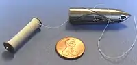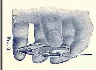 Early vibrating shuttle designs inherited the boat-shaped shuttle used in transverse shuttle machines, where the bobbin is inserted from the open side of the "boat". In the 1880s, bullet shuttles became dominant. The bullet shuttle is long and slender, shaped like a bullet, with a pointed tip that is sometimes called the hook. The bobbin inserts from the rear, and the tip is pointed for the purpose of intercepting the small loop temporarily created (by a brief upward needle motion) in the upper thread—see pictures below of its operation. The bobbin too is long and slender to fit inside the shuttle; in this regard it is very different than the fat rotary bobbins of later sewing machines.