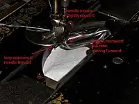 Shuttle is forward again, having completely passed through the loop in the upper thread. Loop in upper thread is now being pulled straight (trapping the lower thread in a lockstitch) by the take-up arm. Needle is still up. |