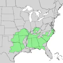 It grows in Alabama, Arkansas, Florida, Georgia, Illinois, Indiana, Kansas, Kentucky, Louisiana, Mississippi, Missouri, North Carolina, Ohio, Oklahoma, South Carolina, Tennessee, Texas, Virginia, and West Virginia.[2][7]