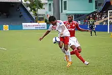 Victory SC player (in white) in action against South China AA during the 2008 AFC Cup match at the Maldives National Stadium.