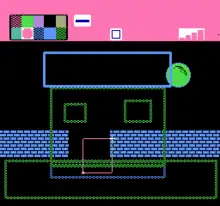 This application allows players to create artwork using a mostly freestyle method, with support for full video animation. The game does not support the use of a mouse or any other external component, requiring users to rely on the NES game controller to draw objects. There is a basic grey screen surrounded by graphics stamps. This application utilizes the CHR RAM chip that is also used in a variety of other contemporaneous NES video games. Thirteen different variations of palettes and seven different kinds of tools (including a pen, various geometric shapes,and the eraser) are available for use in creative compositions.[7] Once the user chooses one of the palettes, there are different colors to choose. The colors include these: turquoise, pink, purple, light blue, and colors that have been dithered.