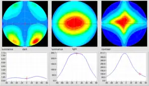 Fig. 5 shows luminance and contrast versus viewing direction in a polar coordinate system. The left column shows the directional luminance distribution of the dark state of the display (here: IPS-LCD), the center column shows the bright state and the right column shows the (luminance) contrast (ratio) resulting from the preceding two luminance distributions. The value is coded by (pseudo) colors. The graphs below the polar coordinate systems each show a cross section in the horizontal plane and indicate the values for luminance and for the contrast.