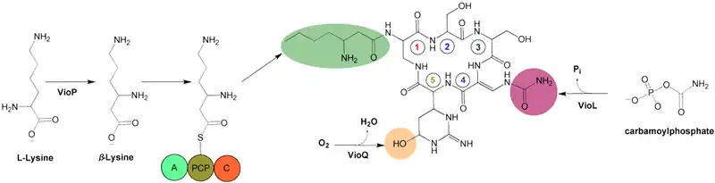 After α,β-desaturation via VioJ, three modifications to the preliminary cyclic structure occur. Hydroxylation of C-6 in the structure occurs by VioQ, N-acylation of α-amino group using β-lysine, VioO, and VioM, and carbamoylation of the β-amino group, producing β-ureidoalanine (β-Uda) by the carbamoyltransferase homologue VioL.