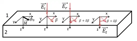 When the magnetization is perpendicular to the propagation wavevector, on the contrary to the Kerr effect, may have all his three components equals to zero making calculations rather more complicated and making Fresnels equations no longer valid. A way to simplify the problem consists to use the electric field displacement vector . Since and we have . The inconvenient is to deal with the inverse dielectric tensor which may be complicated to handle. Here calculation is made in the general case which is complicated mathematically to handle, however one can follow easily the demonstration by considering .