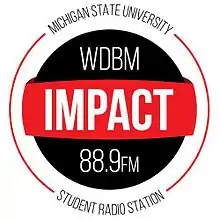 WDBM (88.9 FM), East Lansing, Michigan, United States, branded Impact 89FM, is a 2,000 watt, Class A, student-run college radio station at Michigan State University that broadcasts to listeners in the Lansing metropolitan area. The signal can be heard as far south as Jackson, Michigan, southeast almost to Brighton, and north to Alma (due 34 miles southwest of Midland), far beyond its 60 dBu service contour which represents its clearest signal.[1] The station is the successor to the Michigan State Network, which in the 1970s was the nation's largest college carrier current radio network, and had studios in several MSU dormitories. The network was eventually consolidated to one carrier current station, WLFT ("Tune to the Left"), which broadcast from the former WKAR studios on the third floor of the MSU Auditorium Building. This was also the first home of WDBM-FM.