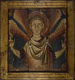 British Museum, c. 1265: Winged seraph on wooden ceiling panel from Painted Chamber, most likely by Walter of Durham and his workshop.