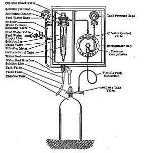 Manual-control chlorinator for the liquefaction of chlorine for water purification, early 20th century. From Chlorination of Water by Joseph Race, 1918.