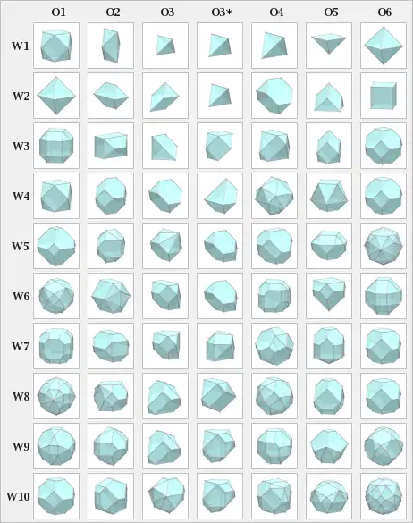 Some Waterman polyhedra create Platonic solids and Archimedean solids. For this comparison of Waterman polyhedra they are normalized, e.g. W2 O1 has a different size or volume than W1 O6, but has the same form as an octahedron.