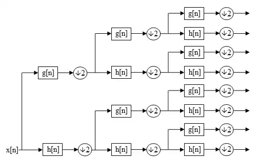Wavelet packet decomposition over 3 levels. g[n] are the low-pass approximation coefficients, h[n] are the high-pass detail coefficients.