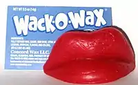 Wax lips are the common name of a confectionery item made of colored and flavored food-grade paraffin wax, molded to resemble a pair of oversized red lips.[1] The lips have a bite plate in the back; when the plate is held between the teeth, the wax lips cover the wearer's own lips, to comic effect. Their popularity among children can be attributed mainly to the comedy of wearing the lips. Although they were intended to be used as a chewing gum of sorts after the novelty of the joke wore off, the lips were often simply discarded rather than consumed.