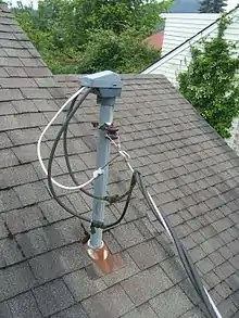 A weatherhead, also called a weathercap, service head, service entrance cap, or gooseneck (slang) is a weatherproof service drop entry point where overhead power or telephone wires enter a building, or where wires transition between overhead and underground cables. At a building the wires enter a conduit, a protective metal pipe, and the weatherhead is a waterproof cap on the end of the conduit that allows the wires to enter without letting in water. It is shaped like a hood, with the surface where the wires enter facing down at an angle of at least 45°, to shield it from precipitation. A rubberized gasket makes for a tight seal against the wires. Before they enter the weatherhead, a drip loop is left in the overhead wires, which permits rain water that collects on the wires to drip off before reaching the weatherhead.