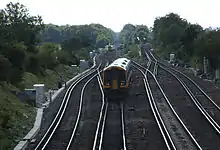 When the line was first opened in 1854, Worting Junction was constructed as a flat junction.[4] This required that down trains heading west and up trains from Southampton cross each other's paths. Initially this was not a great problem, however as traffic and speeds increased the junction became a bottleneck. To relieve this, a flying junction was provided to the south, opening on 30 May 1897. This changed the arrangement so that up trains from Southampton line now crossed over the up and down Salisbury lines on Battledown Flyover, 3+14 miles west of Basingstoke.