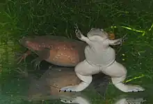 The western clawed frog (Xenopus tropicalis) is a species of frog in the family Pipidae, also known as tropical clawed frog.[2] It is the only species in the genus Xenopus to have a diploid genome.[3][4] Its genome has been sequenced,[5][6] making it a significant model organism for genetics that complements the related species Xenopus laevis (the African clawed frog),[7] a widely used vertebrate model for developmental biology. X. tropicalis also has a number of advantages over X. laevis in research, such as a much shorter generation time (<5 months), smaller size (4–6 cm (1.6–2.4 in) body length), and a larger number of eggs per spawn.[8]