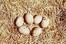Sexually mature females of the western pond turtle produce 5–13 eggs per clutch. They deposit eggs either once or twice a year. They may travel some distance from water for egg-laying, moving as much as 0.8 km (1/2 mile) away from and up to 90 m (300 ft) above the nearest source of water, but most nests are within 90 m (300 ft) of water. The female usually leaves the water in the evening and may wander far before selecting a nest site, often in an open area of sand or hardpan that is facing southwards. The nest is flask-shaped with an opening of about 5 cm (2 in). Females spend considerable time covering up the nest with soil and adjacent low vegetation, making it difficult for a person to find unless it has been disturbed by a predator.