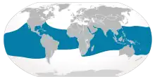 The shark is seen by divers in many places, including the Bay Islands in Honduras, Thailand, Indonesia (Bone Bolango, Cendrawasih Bay), the Philippines, the Maldives close to Maamigili (South Ari Atoll), the Red Sea, Western Australia (Ningaloo Reef, Christmas Island), Taiwan, Panama (Coiba Island), Belize, Tofo Beach in Mozambique, Sodwana Bay (Greater St. Lucia Wetland Park) in South Africa,[74] the Galapagos Islands, Saint Helena, Isla Mujeres (Caribbean Sea), La Paz, Baja California Sur and Bahía de los Ángeles in Mexico, the Seychelles, West Malaysia, islands off eastern peninsular Malaysia, India, Sri Lanka, Oman, Fujairah, Puerto Rico, and other parts of the Caribbean.[70] Juveniles can be found near the shore in the Gulf of Tadjoura, near Djibouti, in the Horn of Africa.[75]