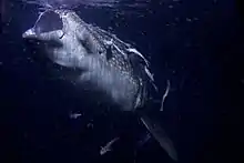 Pupping of whale sharks has not been observed, but mating has been witnessed twice in St Helena.[54] Mating in this species was filmed for the first time in whale sharks off Ningaloo Reef via airplane in Australia in 2019, when a larger male unsuccessfully attempted to mate with a smaller, immature female.[55]