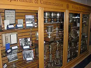 The WPDU has participated in, and traveled extensively to intercollegiate debate competitions since its early history.[9] A regular participant regional and national competitions, the WPDU has previously won the Pennsylvania State Debating Championship,[10] qualified for the National Debate Tournament forty-five times,[3][4] and captured the 1981 National Debate Tournament national championship.[6] In addition, at the 1947 Grand National Forensic Tournament,[11] a two-man affirmative debate team won the national championship competing against 89 other teams, while Pitt's negative team finished as runners-up.[2] The WPDU has also finished first in the American Debate Association’s varsity rankings and its debaters have won hundreds of individual speaking awards.[12] In the past the WPDU hosted major intercollegiate debating competitions,[13][14] and through the years, the team has appeared on television,[15] including once hosting its own weekly television show in the 1950s,[16] and its success has enjoyed coverage in local and regional media.[17][18][19]