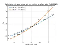 Graph showing result of using modified value κ=1.7*10-7 for the calculation of wind setup, after Feij (2015).[4]