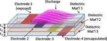 The conventional single dielectric barrier discharge (DBD) actuator design is composed of two electrodes separated by a single dielectric material. Much work has gone into optimizing the design and performance of the single DBD design,[12] however research work continues to improve the performance of these actuators. The MBPA design is an extension of the single DBD actuator design which introduces additional dielectric barriers and electrodes, and thus additional design parameters. Research indicates that MBPA designs may achieve higher resultant thrust and improved thrust-to-power ratios than the single DBD actuator design.[11][13][14] Sample trials of a bi-layer MBPA design demonstrated an approximately 40% increase in effectiveness over the conventional single layer design.[2][13]