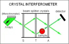 Crystal interferometry, sometimes also called X-ray interferometry, is the oldest but also the most complex method used for experimental realization. It consists of three beam splitters in Laue geometry aligned parallel to each other. (See figure to the right) The incident beam, which usually is collimated and filtered by a monochromator (Bragg crystal) before, is split at the first crystal (S) by Laue diffraction into two coherent beams, a reference beam which remains undisturbed and a beam passing through the sample. The second crystal (T) acts as a transmission mirror and causes the beams to converge one towards another. The two beams meet at the plane of the third crystal (A), which is sometimes called, the analyzer crystal, and create an interference pattern the form of which depends on the optical path difference between the two beams caused by the sample. This interference pattern is detected with an X-ray detector behind the analyzer crystal.[9][43]
