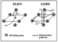 Pictorial view of photoelectron scattering processes in the single-scattering regime, EXAFS (this assumes the single scattering approximation... multiple scattering can be considered with EXAFS), and in the multiple scattering regime, XANES. In EXAFS the photoelectron is scattered only by a single neighbour atom, in XANES all the scattering pathways, classified according to the number of scattering event (3), (4), (5) etc. contribute to the absorption cross section.