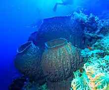 This species is found in the Philippines,[2] Australia,[1] western and central Indian Ocean, Indonesia, Malaya and New Caledonia. These sponges are sessile filter feeders, with a very important role in the ecosystem. Giant Barrel Sponges filter a tremendous amount of water throughout their lifespan (some living up to 2000 years) which increases water clarity, controls algae, and affects coral populations. These sponges also serve as a habitat for many other species such as other invertebrates, benthic fish, bacteria, and cyanobacteria.