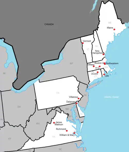 University of Massachusetts Amherst Amherst, MA 1863 Public 1946 Aggies/Redmen/Minutemen UMass Maroon & white[13]