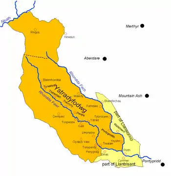 Ystradyfodwg or Ystrad Dyfodwg (Vale of Tyfodwg) was an ancient upland parish in Glamorgan, Wales. It is believed to have been named after Dyfodwg (or Tyfodwg) a 6th-century saint or chieftain. The parish included most of the area which would later be known as Rhondda named for the parish rivers, Rhondda Fawr and Rhondda Fach.