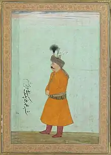 Mohammad Ali Beyg called Zarrinnaal (lit. "Golden Horseshoe"), whose family belonged to the clan of Zarrin Kafsh, had been settled in Kurdistan minimum since the year 1448 A.D. and possessed the area of Sanandaj as their hereditary fief, was ordered by Shah Abbas I the Great to make war on the Ottomans; and on August 24, 1605 with the aid of his troops from the Mokri tribes could reconquer the Turkish occupied Kurdistan Province for Persia. After that he was made vicegerent (Persian vali) of that area and reigned probably from 1609 to 1615 as governor and was head of the administration and army, chief judge and legislator. There, he himself and his entire tribal confederacy (Persian il) were known and henceforth called by the name of "Zarrinnaal".[8] In 1631 Mohammad ‘Ali Beyg was the ambassador sent to the Mughal court by Shah Abbas of Iran, arriving in time for the New Year festival in March 1631. Iran and Mughal India went in negotiations about the province of Kandahar, once part of the Mughal empire, then given by Humayoun to Shah Tahmasp and annexed by Humayoun's successor Akbar. In 1622 Shah Abbas had reconquered Kandahar as his rightly possession and a treaty with Jahangir should secure this status quo. Mohammad Ali Beyg remained in the Mughal empire until October 1632, during which time his portrait was painted by the royal artist, Hashim. The painting is inscribed in Persian ‘Likeness of Mohammad ‘Ali Beyg, ambassador, the work of Hashim’.