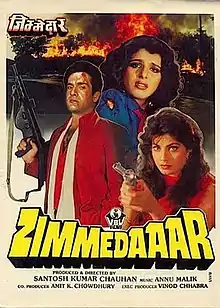 Zimmedaaar is a 1990 Indian Hindi-language drama film directed and produced by Santosh Kumar Chauhan. It stars Rajiv Kapoor, Anita Raj and Kimi Katkar in pivotal roles. After this movie, Rajiv Kapoor did not feature in any films for over thirty years. This was also his last film to be released when he was alive. His final film, Toolsidas Junior (2022) was released posthumously a year after Kapoor died in February 2021.[1][2]
